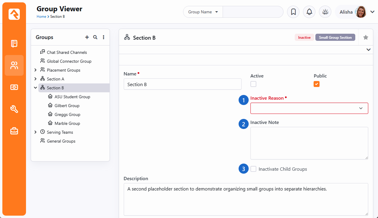 If enabled in the Group Type settings, you’ll be prompted to provide additional details after inactivating a group.