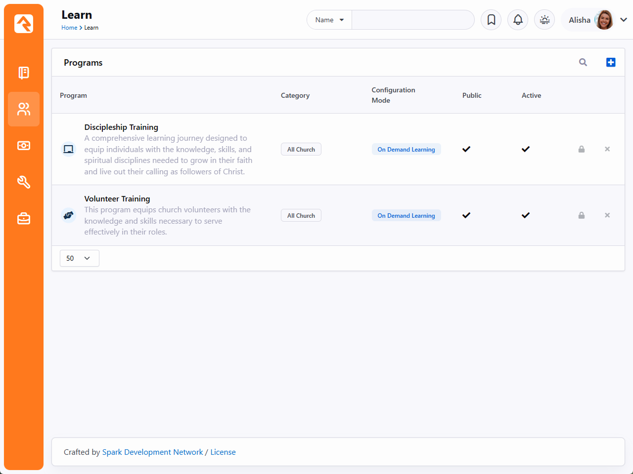 Starting in v17, the Learning Management System (LMS) in Rock RMS provides tools to create and manage educational content, training programs, and courses within your organization. This will allow you to assign training, track progress, and maintain training records. Rock's LMS is designed to support two distinct scenarios: On-Demand: This mode is designed for flexibility, allowing classes to run continuously without being tied to a specific time frame. Students can join and complete courses at their own pace. This straightforward structure makes it ideal for ongoing or self-paced learning environments.Academic Calendar: This mode is designed for programs that require strict time-based semesters, often found in more traditional academic settings. This introduces some additional complexity, and while it provides features like a class progress bar, a syllabus for detailed course planning, and a notifications area for managing assignments, these tools are most beneficial for structured, residency-style programs. For simpler or ongoing courses, these additional features may not be necessary, and the flexibility of On-Demand mode is likely a better fit. When in doubt keep it simple and use On-Demand. Academic mode is really intended for organizations that have residency/university programs. Terms Before we get started, let's clarify a few terms: Program: The Learning Program is the highest level of the learning hierarchy and represents a collection of related courses. Examples of a program could include Biblical Studies, Student Residency, or Volunteer Training.Course: The Learning Course represents a specific type of class that is offered in the program. Examples of a course might be Torah, Gospels, Biblical Hermeneutics, or Emergency Response Training. For each course, you will have one or more instances of a class, depending on the mode or desired class size.Semester: The Learning Semester is a time block used to group classes for programs that are in the Academic Calendar mode. Examples might include Fall 2024, Spring 2025, etc. This won't apply to On-Demand mode since those classes typically don't need to be bound by a timeframe. Class: The Learning Class is an occurrence of the course for a given time. Examples of a class would be Torah – Spring 2025 or Gospels – Spring 2025. The class is generally tied to a collection of the following:Learning Plans: These are the building blocks of your class, consisting of activities that guide students through the course. Rock provides several Activity Types to accommodate different learning styles and objectives. For example, an activity might involve watching a video, completing an assessment (quiz or test), uploading a written paper, or delivering a presentation in front of a teacher or class. The Activity Types are: Acknowledgment: An activity that collects the student's acknowledgment of a statement you configure.Assessment: A configurable activity that presents multiple-choice and short-answer questions to evaluate the student's understanding.File Upload: An activity that allows students to submit files, such as written papers, to the teacher or facilitator.Point Assessment: An activity that provides the student and teacher/facilitator with instructions and a grading rubric for an assignment.Video Watch: An activity that ensures students watch a specified portion of a video as part of the coursework. Students: Individuals enrolled in the class.Facilitator(s): Teachers or assistants who grade learning activities. Grading System: The LMS offers flexible grading systems (Completion, Pass/Fail, Letter Grade) to evaluate and track student progress in a class. These can be customized to suit your organization's needs and are detailed in a later chapter. What You'll See Now that we've covered the basics, let's explore what you'll encounter when working with the LMS. Keep in mind that LMS features can be accessed in two areas: internally within the Rock system (/people/learn) and externally through the Learning Hub (/learn), which we'll cover in a later chapter. Once your classes are set up, the external-facing Learning Hub page will showcase all the programs and classes you offer.