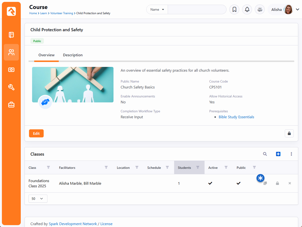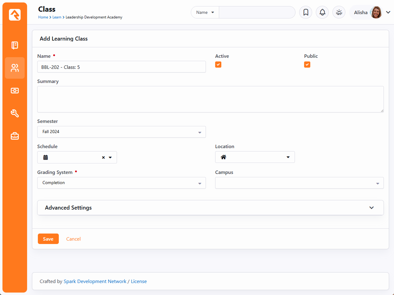A class represents a specific instance of a course offered during a particular time period. Each class has its own Learning Plans, students, and facilitator(s).