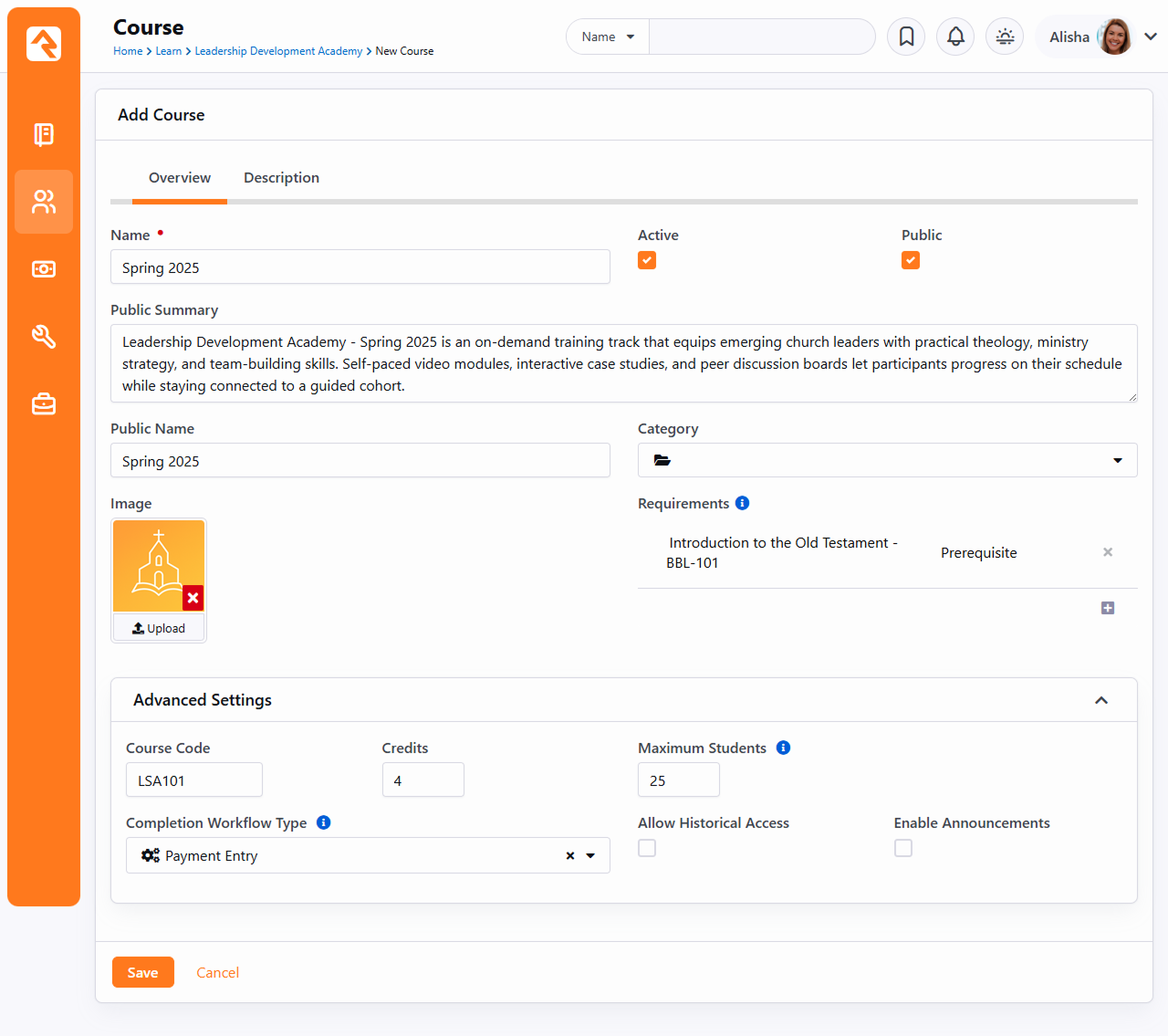 Courses are a specific type of class that is offered in the program. You can create one or more instances of these depending on the settings or desired class size. Overview / Description - Use the Description tab to edit the course description, which appears on the public Learning Hub page to provide individuals with a detailed understanding of the course.Requirements - Specify prerequisites or equivalencies here. For example, you can indicate if a course requires the completion of another course beforehand or if it fulfills the requirements of an equivalent course.Course Code - An abbreviated identifier for the course, useful in contexts where concise designations are needed.Credits - A unit of measurement representing the academic work associated with the course. Credits typically reflect the time commitment, workload, and expected learning outcomes.Completion Workflow Type - An optional workflow that can be triggered when an individual completes the course.Allow Historical Access - Controls whether returning students can view or review their completed class activities after the class has concluded.Enable Announcements - Enable this option to allow creating announcements related to the classes. These announcements will be displayed on the student's Class Workspace. Note: This setting is only available for Academic Calendar mode.