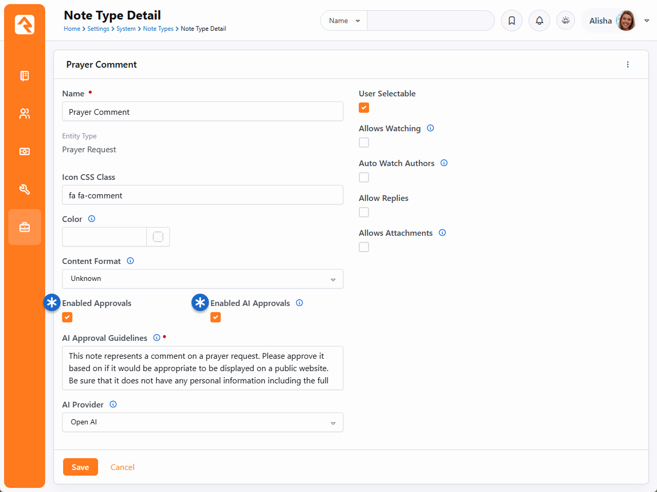 To activate this feature, navigate to Administration > Settings > Note Types, then edit the Prayer Comment note type. Check the Enable Approvals and Enabled AI Approvals boxes. Next, provide clear guidelines to help the AI determine which comments should be approved or disapproved.