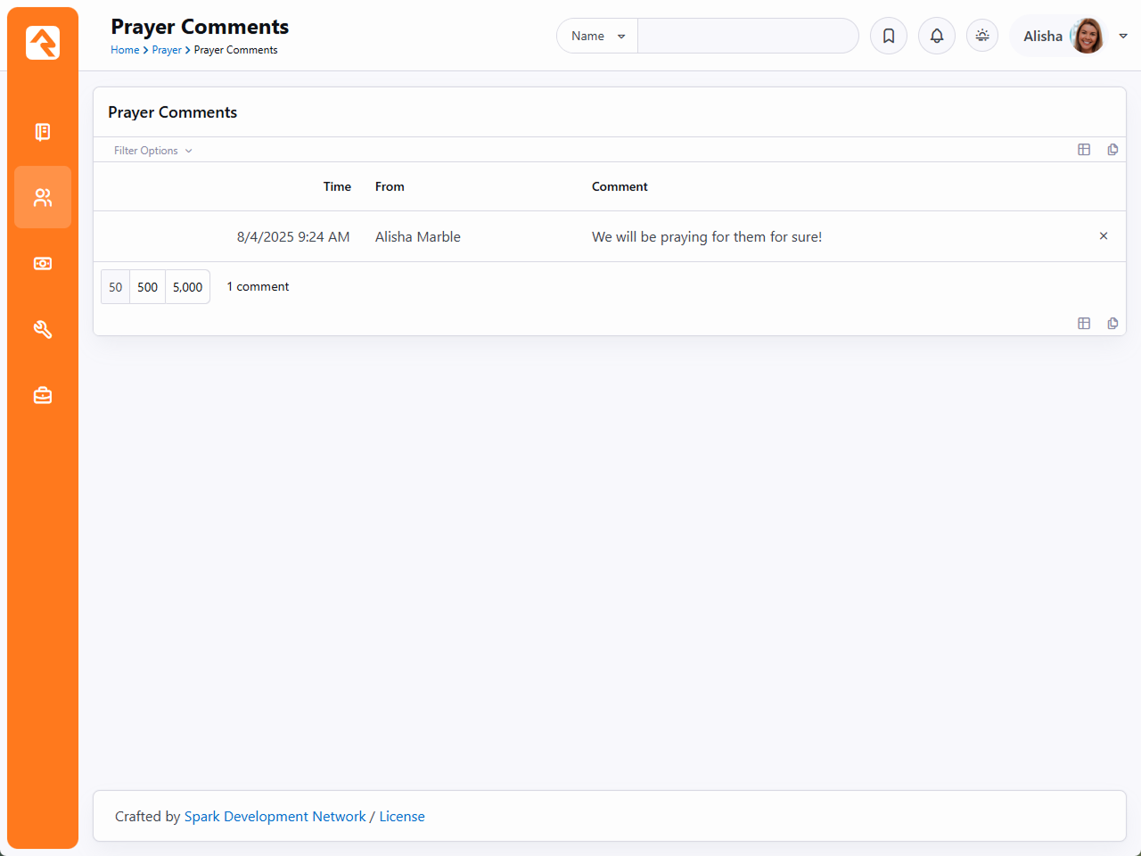 Selecting the Prayer Comments option will display a list of all the prayer comments in the system. This is a good way to help moderate the comments that are coming in without having to view each prayer request. Selecting a comment will take you directly to the prayer request page.