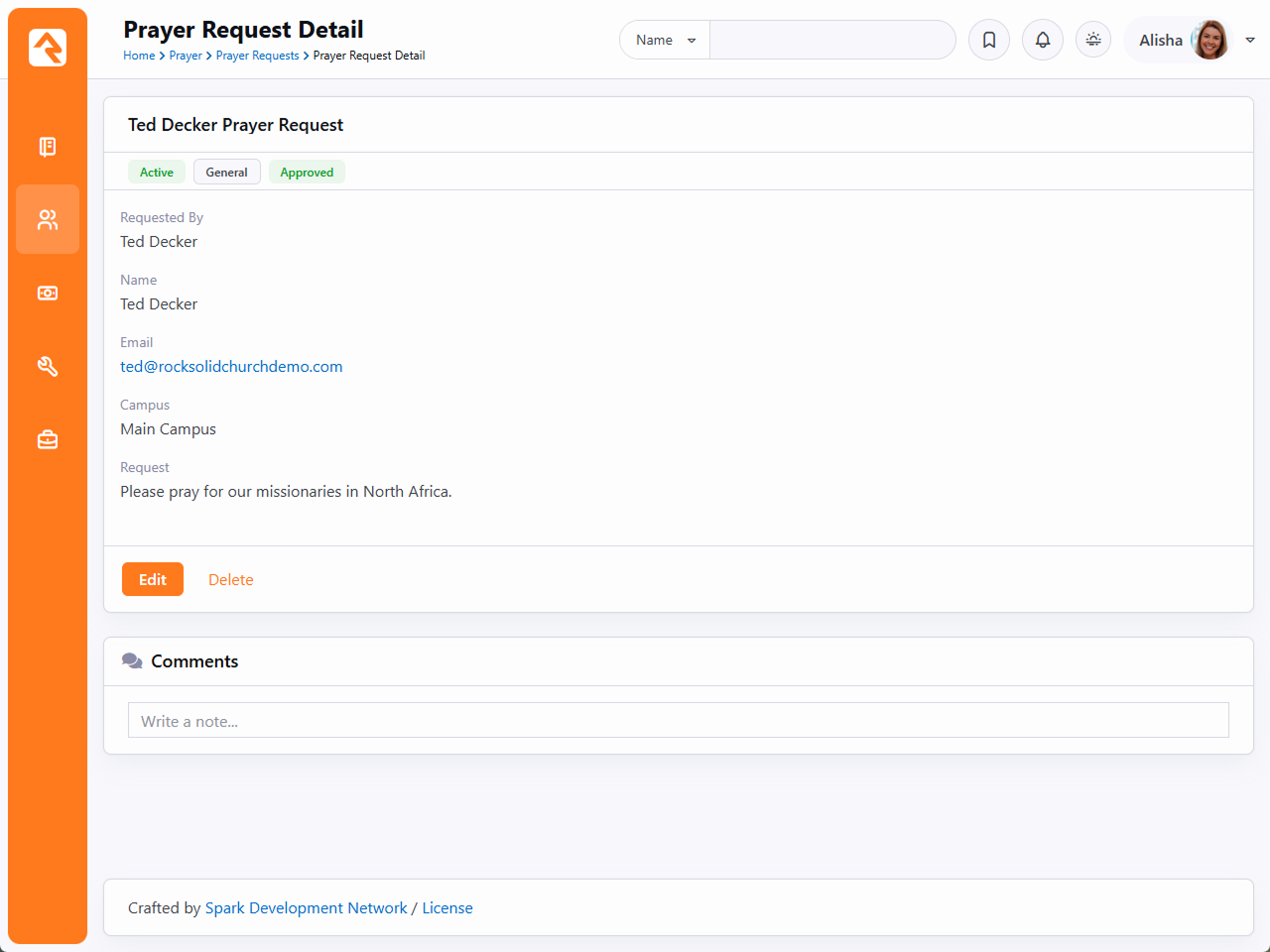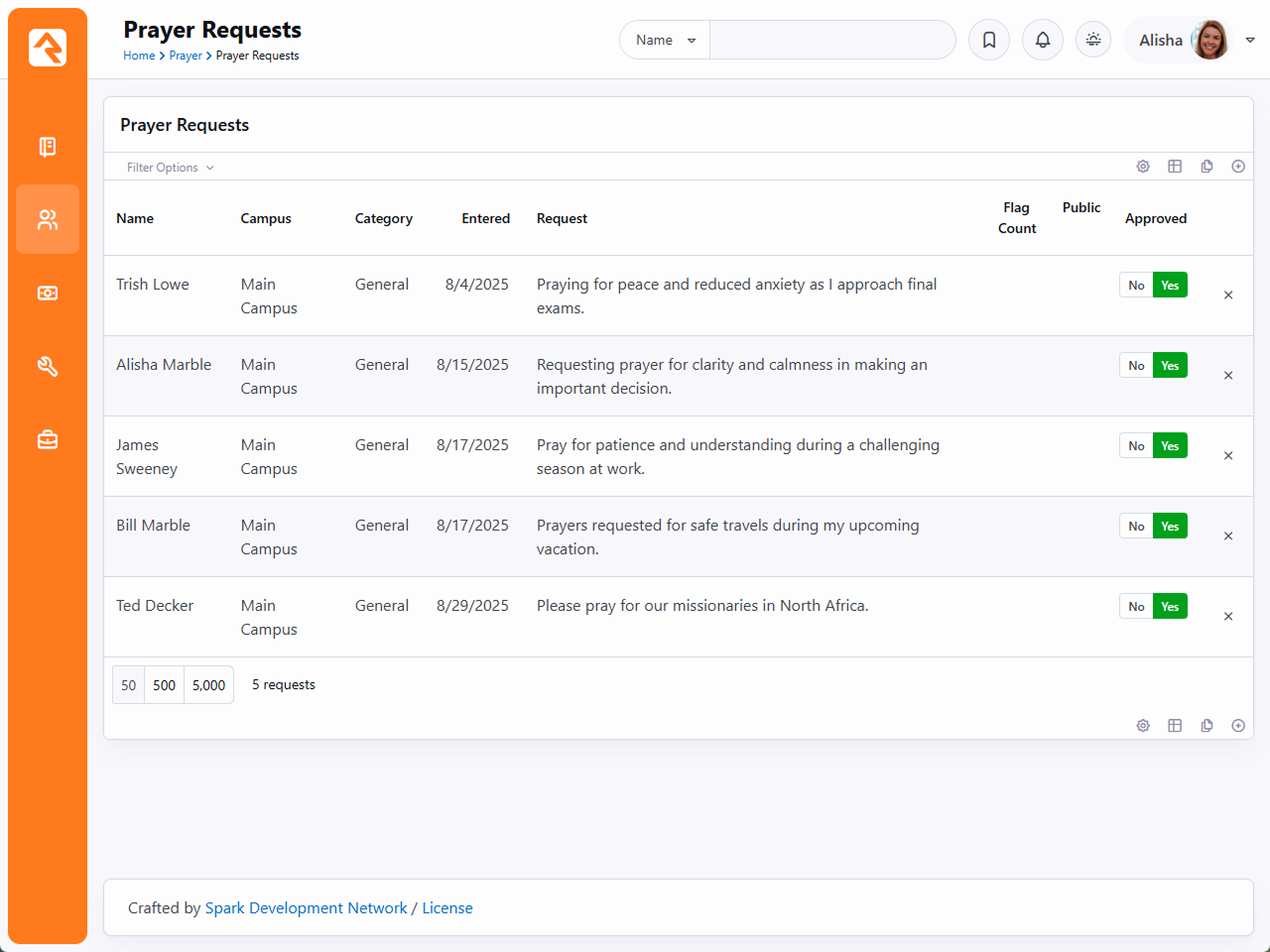 Selecting the Prayer Requests option will display a list of all the prayer requests in the system.