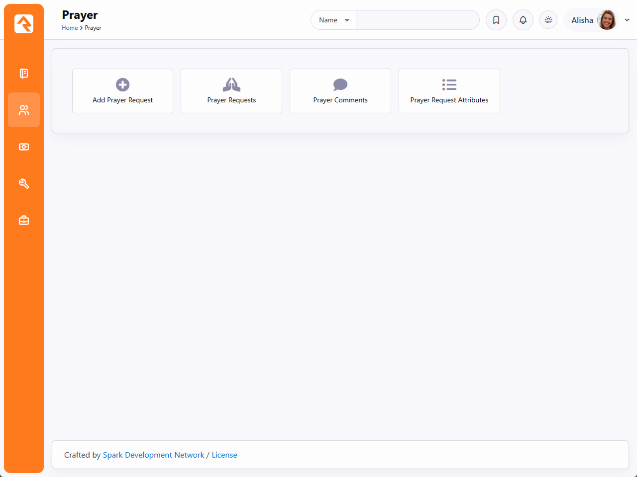 All administration work is done under People > Prayer. Here, you can select to add a new prayer request, view current requests or view all the comments in the system.