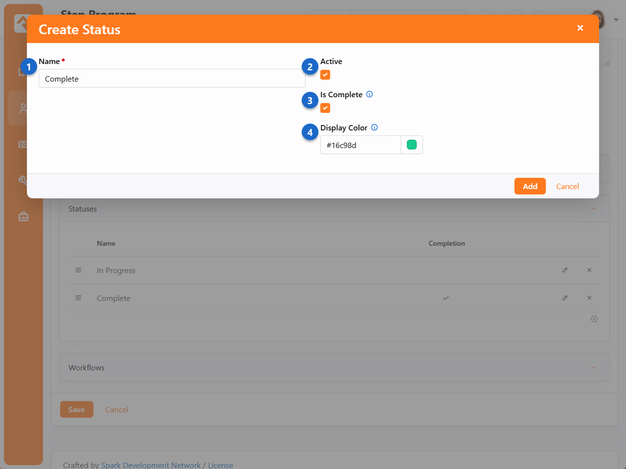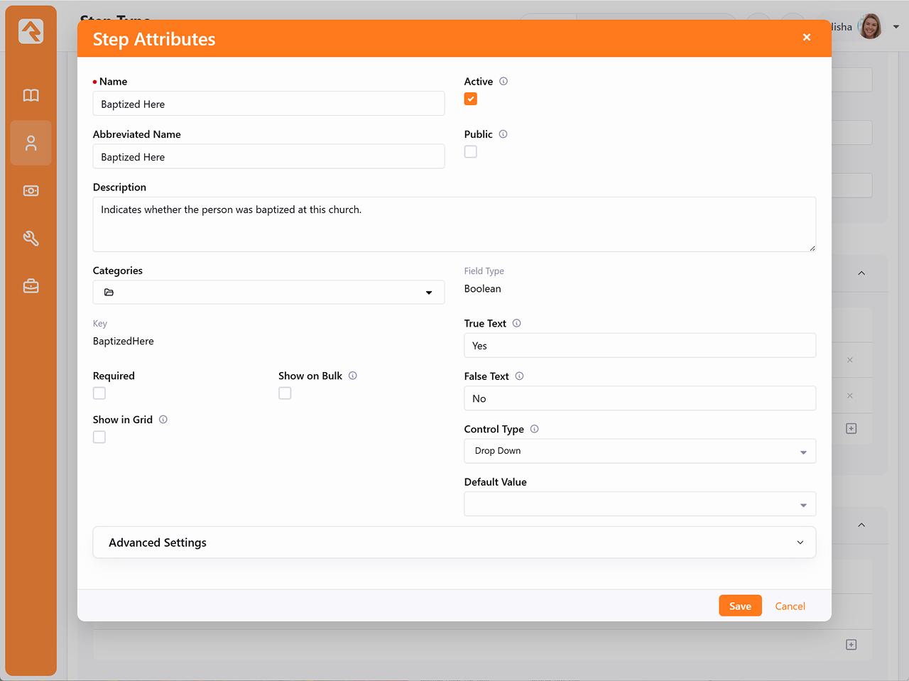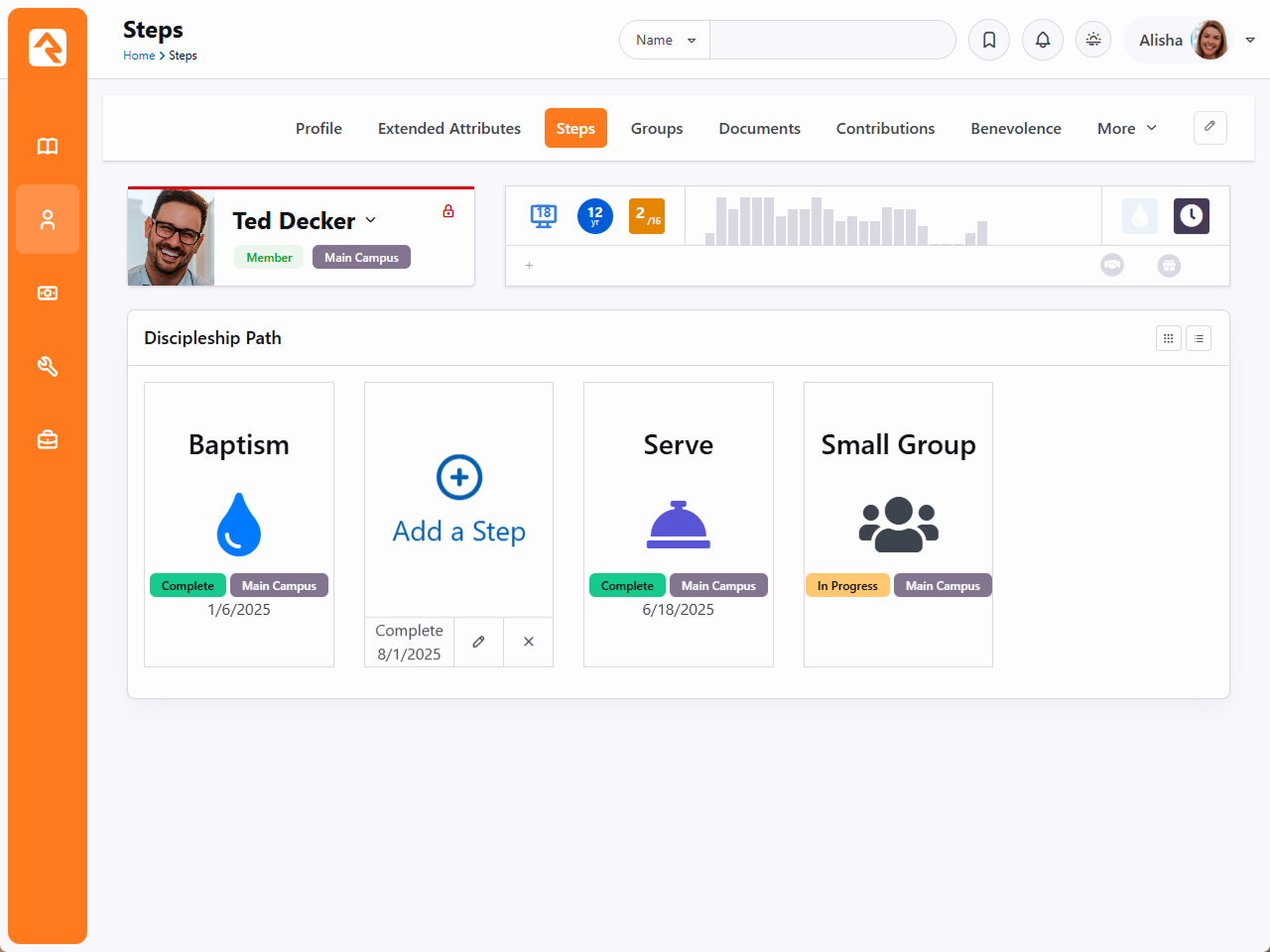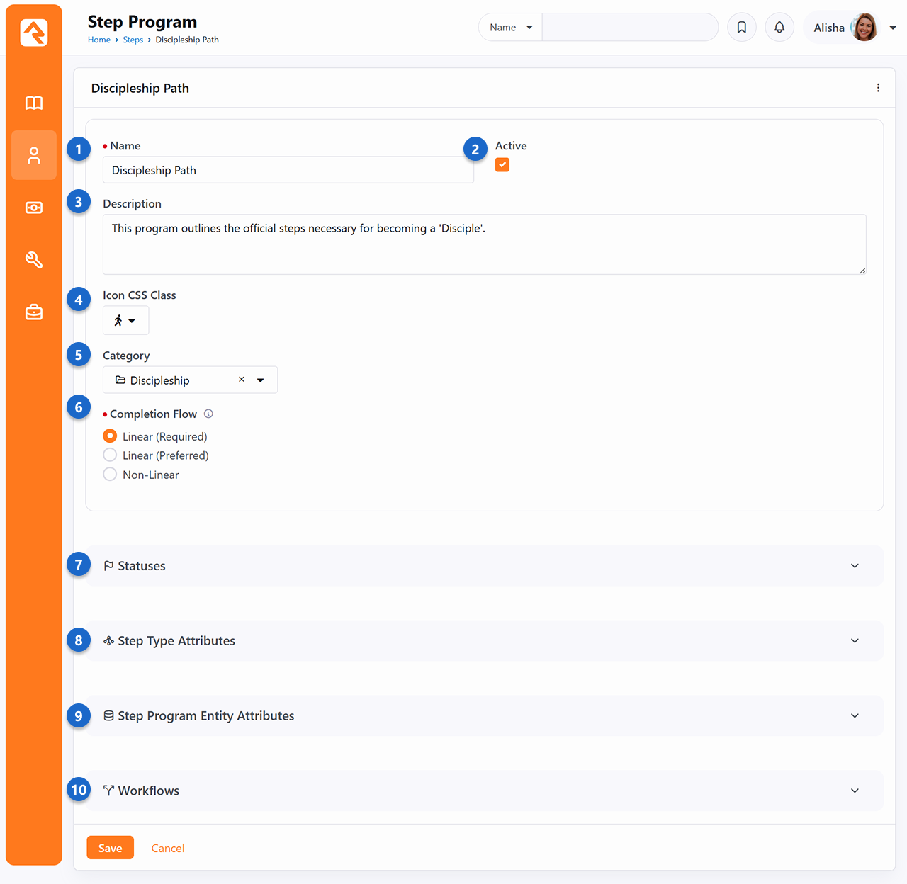 Let’s go back to the Step Program page to see how we can edit our programs. Clicking the Edit button lets you update the program and its configurable settings. Name - Provide the name of the program.Active - Set the program to active or inactive.Description - Add a meaningful description of the program.Icon CSS Class - Choose the CSS icon to use for the program. Category - Categories help to group your related programs. You can view and manage step program categories from Admin Tools > Settings > System > Category Manager using the Step Program entity type. Completion Flow - Defines how participants progress through the steps in a program.Linear (Required): Steps must be completed in order no matter what; custom prerequisites will be removed. Linear (Preferred): Step ordering is preferred but not required, and prerequisites are enforced. Non-Linear: Ordering is for display purposes only; prerequisites are enforced. Statuses - This is where you'll set the different statuses, like 'In Progress' or 'Complete' for the program. We'll discuss this area in detail below. Step Type Attributes - This is where you can create attributes that will be applied to each Step Type associated with this Program. These can be seen and edited when editing the Step Type. Step Program Entity Attributes - Displays Entity Attributes labeled Step Program if any are configured. More on this below.Workflows - Workflows and Step Programs are a powerful combination. We'll go into details on the options available to you below. Default List View Steps information for an individual can be viewed under the Steps tab on the person profile, either as cards or in a grid. You can toggle between these views from within the person profile using the ti ti-grid-dots and ti ti-list buttons. As noted in the prior section, the default view is set at the step program level. The screenshots above (cards) and below (grid) are both for the same person following the Discipleship program. While in card view, hovering over a card lets you view additional details as well as access the Step Entry page. This is controlled by the Step Type Advanced Settings (see Editing Step Types). NoteStep SecurityA person needs to be in a role with Edit permission for the Steps block in order to add steps from the Person Profile page. TipCards or Grid?The cards view will condense multiple occurrences of a step into a single card, whereas the grid view will display a row for every occurrence of the step. For this reason, the grid view may be more appropriate for step programs that allow steps to be repeated often. The grid view also displays a "Summary" column that shows step attributes configured to show on grids. If you have multiple campuses, you can choose to show or hide the campus associated with a step by changing this block's settings. This applies to both the cards and grid views. The default view doesn't have to be the same for all of your programs. Choose the one that seems best for each individual program. You can always change it later if you need to. Statuses The values you set up here are used to track an individual’s status for any step type in the program. This list shows each status and whether it is treated as Completing the step. The Create Status page is used when adding or changing a status. Name - Add the name of the status (e.g., In Progress).Is Active - Set the status to active or inactive.Is Complete - Select this option only if the status means the entire step has been completed.Display Color - Select the display color for the status. TipCompleted But Not CompletedIn the Step Entry section we discussed the “Date Completed” field. It’s important to note that this date, by itself, is not enough to indicate that the person has finished a step. For a person to truly complete a step, an “Is Complete” status and a completion date should both be present. Entity Attributes If you have an Entity Attribute configured for Step Programs, it will appear in the settings here. Using Entity Attributes for Step Programs lets you apply attributes across all programs. In this example, Internal Program is a Boolean that can be selected for any Step Program. This works well for attributes you need system-wide. To add a new attribute for this program, go to Admin Tools > Settings > Entity Attributes and select Step Program as the Entity Type. Workflows Here you can add one or more workflows to the program. Keep in mind that workflows added to the program apply to all the steps in program, regardless of the step type. The workflow can be launched according to one of three triggers: Step Completed: The workflow is launched when the step is assigned any “Is Complete” status (see Editing Step Programs). Status Changed: The workflow is launched either when there is any status change, or according to specific status changes you define.Manual: The workflow is launched by a manual click of a button. See our Blasting Off With Workflows guide for more information on creating workflows. TipWhy Use Step Program Workflows?Applying a workflow at the step program level (as opposed to the step type level, described in the next section) is a great way to save yourself time and effort on repetitive tasks. For example, do you have an email that should be sent after the completion of each step in a program? If so, it can be added and maintained once at the program level instead of individually for each step type.
