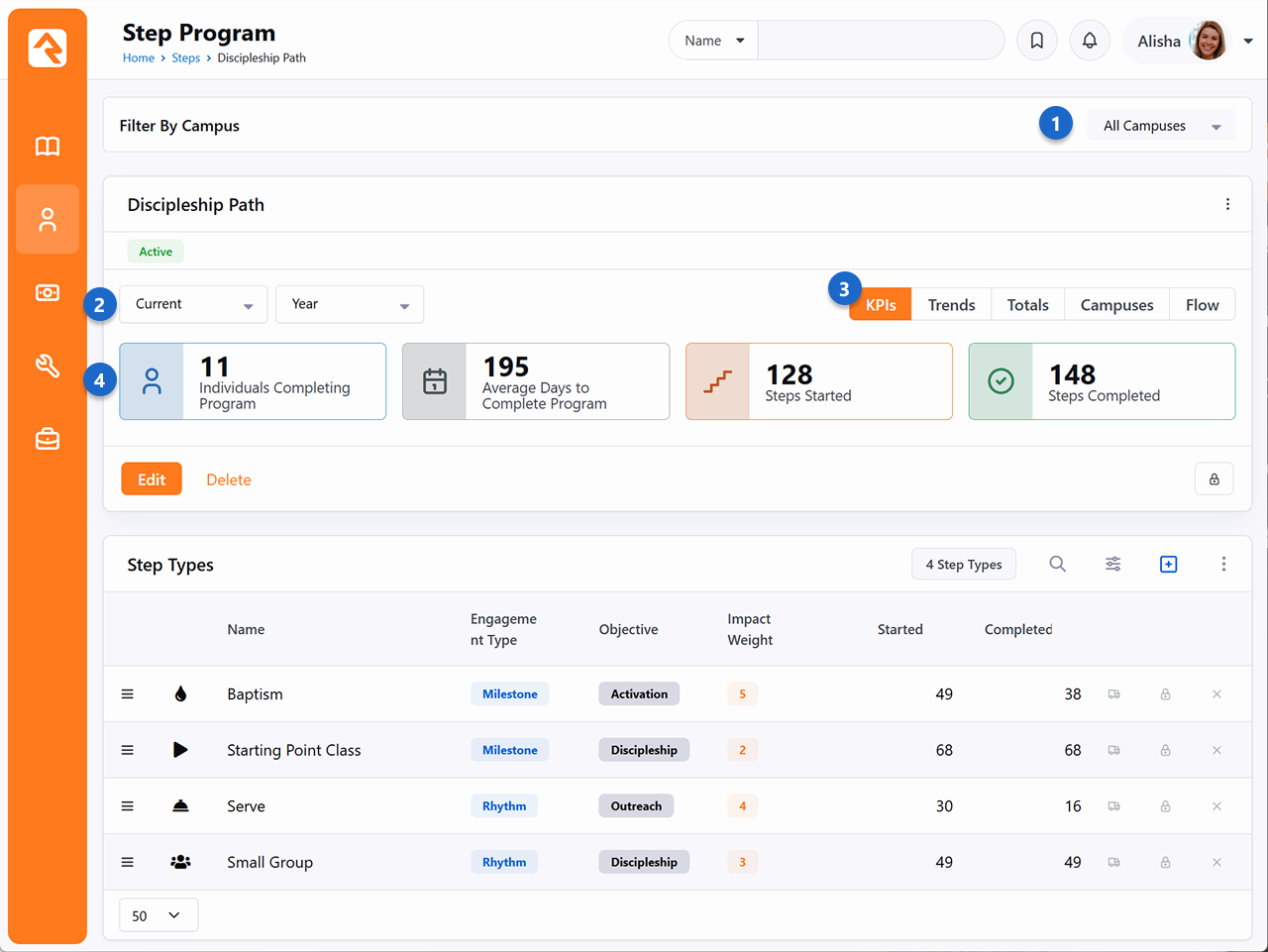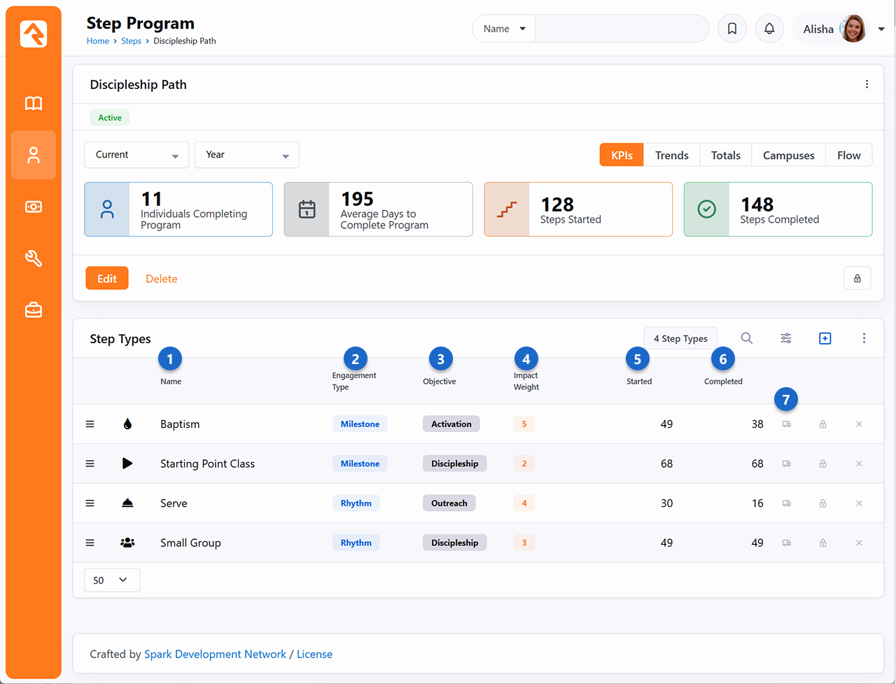 The Step Program page has a detail block at the top and a list block below. There’s actually a lot to see and do on this page, so for now we’ll just get familiar with the page itself before diving into the setup and maintenance in later sections. Let’s take it from the top and look at the detail block first. Campus - You can select a campus to only show step information from that campus. The step metrics, chart and step type information (see below) will all be updated to show data only from the selected campus.Description - A good description helps clarify the program’s purpose.Category - The category assigned to the program is displayed for reference.Step Program Metrics - These metrics provide good information on the overall program. The values include:Individuals Completing: This is a count of unique individuals who have completed the program. People who complete the program multiple times will only be counted once.Average Days to Complete: The average number of days to complete the program is calculated based on the earliest Start Date and the latest End Date across the steps in the program.Steps Started: A count of the number of steps that have been started, regardless of whether they were completed.Steps Completed: This is a count of all completed steps in the program. Step Program Activity Chart - This is a stacked area chart (a chart where areas don’t overlap because they are cumulative at each point) showing completed steps by step type. This chart actually has a lot going on, so we'll wait to break it all down for you later in the Next, let’s move down to the list block at the bottom of the page. Here you can see and maintain the step types included in your program. Name - The step type names are each listed here.Engagement Type - Notes whether the step is a Milestone or an ongoing Rhythm. This is configured in the Step Type settings. Objective - Describes the main focus of the step and how it supports the organization’s mission. This is configured in the Step Type settings. Impact Weight - Represents the significance of this step in a person’s journey. A higher value indicates greater impact, helping to measure progress at an organizational level. This is configured in the Started - Shows a count of how many times the step type has been started.Completed - Shows a count of how many times the step type has been completed.Bulk Entry - The ti ti-truck icon will take you to the Bulk Entry page, where you can add steps of that type in bulk. We’ll cover how to do that below. TipNot Adding Up?You'll sometimes notice that the counts for Started or Completed steps are higher than the number of people in your program. If you're doing any analysis with these numbers, it's important to keep in mind that a single person can be counted more than once if the step allows multiple completions. In the Editing Step Types section we’ll dive deeper into how the information in this block gets added and maintained.