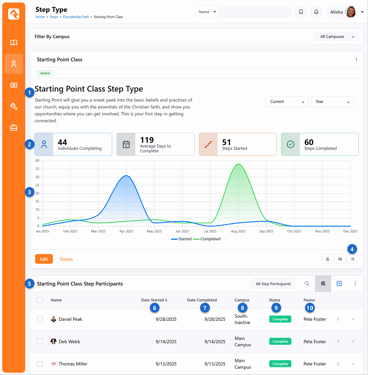 Next, let's shift our focus to one of the individual step types within our example program. The layout of the Step Type page is very similar to the Step Program page. You’ll see a familiar detail block at the top, followed by a list of step participants below. From here you can maintain the list of participants and view their progress as they start and finish the step. Name and Description - The name of the step type is shown at the top of the page for reference. A description for the step type adds context and meaning.Step Type Metrics - These are the same metrics as discussed in the prior section but showing only data for the individual step type being viewed.Steps Activity Chart - This overlapping area chart shows when the step type has been started and/or completed. We’ll unpack all the pieces of this chart later, in the Steps Charts chapter. Step Type Move - Move a Step Type from this program to another. For more, see Step Type Moves.Step Participants - All individuals who have started and/or completed the step type are listed here.Date Started - This is when the individual started the step. This column only appears if the step type is configured to span time.Date Completed - This is when the individual completed the step. If the step type doesn't span time, then this is the “Date” associated with the step (see Step Entry). Status - The status for each person is displayed, using values configured at the program level (see Editing Step Programs). Campus - See which campus this step occurred at.Attribute - Any step attributes you create with the "Show in Grid" option selected will be displayed here. In this example we've added an attribute to show which pastor is related to the step. In the Editing Step Types section we’ll dive deeper into how all of this gets set up and maintained. At this point it's just important to be familiar with the kinds of data shown on this page.