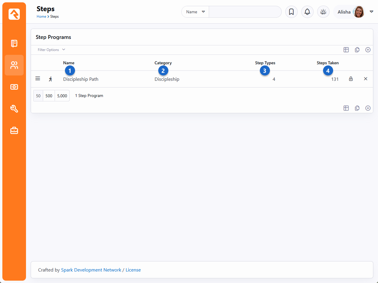 You can access your step programs under: People > Engagement > Steps. This is also where you’ll go to create new programs, which we’ll cover later in the Editing Step Programs section. Name - The name of the step program.Category - Categories are a great way to group and organize your programs. You can view and manage step program categories from Admin Tools > Settings > System > Category Manager using the Step Program entity type. Step Types - A count of all step types, either active or inactive, included in the program.Steps Taken - A count of all completed steps for all individuals in the program.
