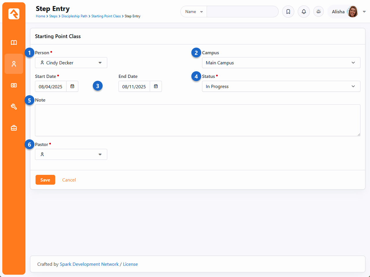 Shepherding individuals through your program can be done either from the Step Types page or from the Person Profile page (which we’ll examine in the next section). Whichever path you take, you’ll wind up at a Step Entry page like the one pictured below. This is where you'll maintain step type information for an individual. Person - In this example we’re adding a step from within the Steps area, so we need to provide a person. Steps entered from the Person Profile page will automatically populate the person’s name. Campus - If you have multiple campuses configured, you can optionally associate the step with a particular campus.Start Date/End Date/Date -Spans Time: If the step spans time then Start Date and End Date fields will be available. Use these fields to track the dates on which a person has started or finished a particular step. These are displayed as the “Date Started” and “Date Completed” fields on the Step Types page. Does Not Span Time: If the step doesn’t span time, then you’ll see only a single Date field. In this case the date is treated as an end date and will be displayed as the “Date Completed” on the Step Types page. Status - Here you can update the individual’s status for the step. We’ll show you how to maintain the list of statuses when we talk about Editing Step Programs in the next section. Step Note - Here you can add a Step Note to the step, to track details or record items for future reference.Step Attributes - Any attributes applicable to the step will appear here. We’ll cover how to set up step attributes below. When you add or change a step for a person, a history of those changes can be viewed on the Person Profile page under the History tab in the Person History section. While the Step Entry page is used for manually maintaining step information for individuals, there are automated alternatives. Steps can be updated from Streak Achievements or as part of a Workflow.