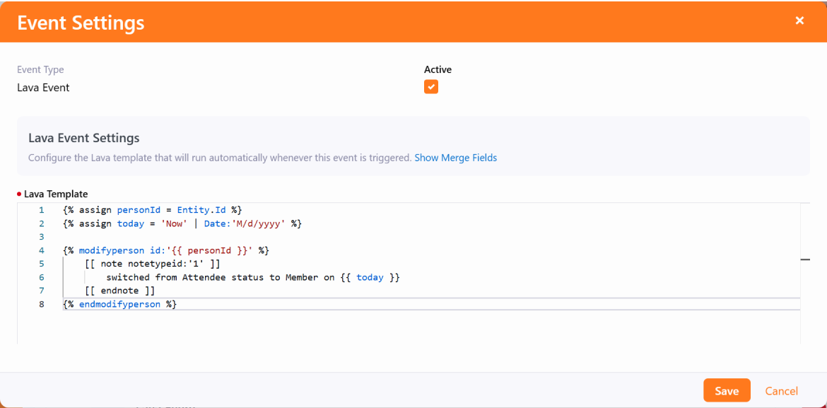 Now that we've defined when our Automation will be triggered, let's move to the next part of an Automation, defining what happens when it's launched. Note that Event options are the same regardless of Trigger Type. Continuing with our Adult Connection Status Change example, we will start the "Launch Workflow" event, triggering the "Member Welcome" workflow, which will set up the Person Profile for new members. In addition to a Workflow Launch our Automation will run a "Lava Event". This event Logs a short note for the new member. When using Lava in Automations, you have many valuable fields to draw from to provide context: Entity: The entity that was added, modified or deleted.Person: The person that added, modified or deleted the entity.OriginalValues: The original values of the entity before it was modified. This is only valid if State is Modified.ModifiedProperties: The names of the properties that were modified on the entity. This is only valid if State is Modified.State: The state of the entity during the save operation. And there you have it, we made an Automation that sets up data for new adult members, no human action needed! Now you have seen an example of Lava and Workflows, but there's more Events to choose from. Automation Events List Below is a complete list of Events that can be run for an Automation. With a trigger and event configured--and the Save button pressed--the automation runs on its own. Now you are free to lean back in your chair and put your hands behind your head.