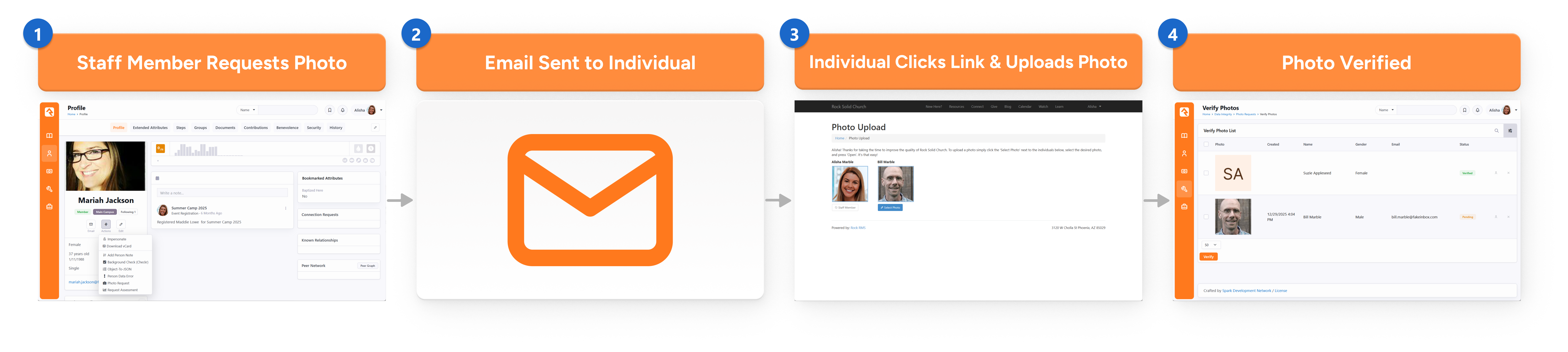 Rock is about fostering relationships. Nothing helps this more than having photos in the system. In the past, keeping up with photos was a complex and time draining task. No longer! Rock makes it easy to populate photos into the database by asking individuals to upload a photo from an emailed request. Let's take a look at how it works. Request - Staff sends out a photo request. This request, as we'll learn soon, can be an individual request to a single person or a bulk request.Sent - An email is sent to the individual asking them to upload a photo.Photo Uploaded - Once they click the link in the email, they'll be taken to a page where they can quickly upload a photo.Verify - Once the photo is uploaded, it's added to a list for a staff person to verify. Photo Upload When the individual clicks the upload link in their email, they'll be taken to the page pictured below. This page is under External Homepage > Support Pages > Photo Upload but it isn't linked into the website, so you'll have to get there from Admin Tools > Settings > CMS > Pages. The link they use to get to this page has an embedded security token that allows them to upload their photo without having to log in. The block on this page has a couple of settings you can use to alter its behavior. These settings include: Include Family Members: This setting will allow the individual to upload photos for their whole family from their link. The default value for this setting is true.Allow Staff: This setting allows staff members to change their own photos. Some organizations may not want staff to update their photos as they have standard staff photos they'd like to keep consistent. The default value for this setting is false. Bulk Requests The easiest way to get a large number of photos into the system is to use the bulk photo request option. You can make these requests under Admin Tools > Settings > Communications > Send Photo Requests. This screen allows you to send an email to a selected list of people asking them to provide a photo for the system. Family Roles - Indicate if requests should go out for adults, children or everyone.Age is more than - If you allow requests to be sent to children, you can provide a minimum age.Connection Status - Select the Connection Statuses you'd like to use as a filter. If none are selected, then the request will go to individuals with any status.Exclude - It's not helpful to request a photo from someone who already has one in the system. This feature allows you to exclude those who have a photo newer than a set number of years.Send - When you're ready, click Send.Test - It's often a good idea to send yourself a test email to see what the recipients will be sent. After clicking Send, the individuals will receive an emailed request to upload their photos. The contents of this email can be modified under: Admin Tools > Settings > Communications > Communication Templates > Photo Request Template. NoteTip to Limit AbuseTo help minimize the potential abuse of this feature by staff, there's a block setting that limits the number of photo requests that can be sent without approval. The default is 300. Feel free to change this number to suit your needs. The block uses the same approval process as bulk email. But There's More Using the bulk photo request screen above is a great way to send out mass requests for photos. You can also send this same email to a list of people using the Photo Request communications template. Let's say you have a report that lists people for an upcoming event, and you'd like to get their photos before the event. By clicking the ti ti-message button in the grid's footer you'll be taken to the New Communications page. Click the Use Simple Editor button near the top right of the block, then select the Photo Request Template from the Template dropdown and you're off to the races! See our Communications guide for more information. Individual Requests Bulk requests can help you populate your database with a large number of photos, but sometimes a personal request is needed. From an individual's Person Profile page, you can quickly request a photo under: Actions > Photo Request.This will launch a short workflow entry screen that allows you to type in a personal message to the recipient. Rock will add some instructions and links to your email to enable the upload process. Verifying Photos While it's highly unlikely, it's possible that someone could upload an inappropriate image. To help filter these out, Rock has a photo verification process. When a person uploads a photo, it's immediately available for viewing. At the same time, it's also added to a list to be manually verified. This list can be found under:Tools > Data Integrity > Photo Requests > Verify Photos. Show Verified Photos - By default, this screen only shows photos that need to be verified. Checking this box will show all photos, even those that have already been verified.Select All - Checking this box will select all the records visible on the list.Photo Records - Photos that have been submitted are listed here, along with details of the person.Status - You can check the current status of the photo.Verify - After selecting photos to verify, you must click Verify. Photo Opt-Out When an individual asks to be opted out of receiving future requests for photos, they are sent to the opt-out page which is located under: External Homepage > Support Pages > Photo Opt-Out They are also added to an application group called Photo Request with a member status of Inactive. You can view and manage this list under: Tools > Data Integrity > Photo Requests > Photo Request Application Group To remove someone from the opt-out list, simply remove them from this group.