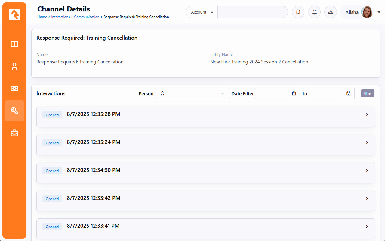 Now, the fun part—when you get to interactions, you can see even more details. For instance, you’ll find out that on 10/18/2024 at 5:21 PM Ted Decker opened an email you sent. If you’re looking at a channel with a Medium of Website, then the interactions it contains will tell you who visited a page, which page was visited, and when it was visited. These details give you a deeper understanding of how people are engaging with your content. The image below shows a list of Interactions coming from an email. Here we can see that several people opened the email at the date and time shown on the screen. This same structure applies to all types of interaction channels. Whether it’s a website, a communication, or something else entirely, each channel holds components which contain sets of interactions.