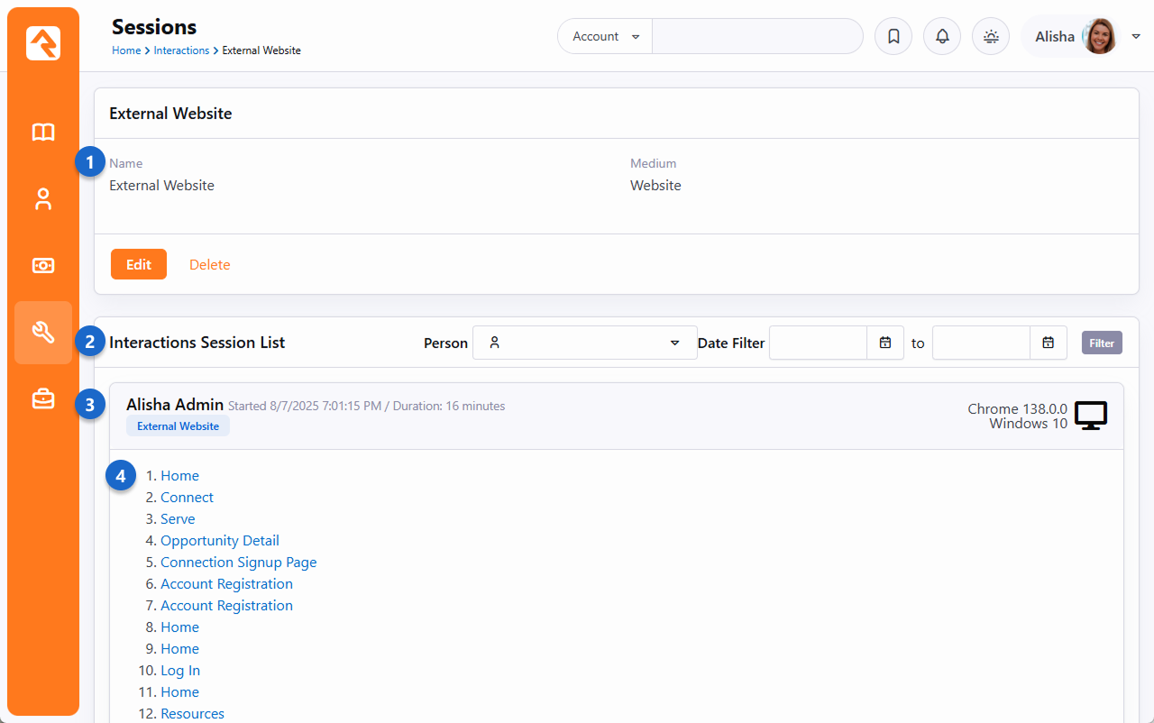 An Interaction Session is like a snapshot of the person's entire visit to your site. It groups all the interactions that took place during a single browsing session, capturing important details like which device the visitor used, when the session began, and how long they stayed. Interaction. Sessions give you a full picture of a person’s overall experience during their visit, even if they hop between multiple pages. Interaction Channel - This is where you would go to make changes to the Interaction Channel itself. Generally, you won’t make any changes here.Interactions Session List - All of the sessions that Rock has captured are listed below this header. Here you can also filter by Person (the person who visited your site) or by the date of the interaction.Session Data - As you can see, a variety of data points are provided to you, including the length of the session, the name of the person, and what sort of technology they were using to access the site.Visited Pages - In this case, below each Session Data header, we see the list of pages that the person visited, in the order in which they visited them. Clicking on any item in this list will bring you to that page. In some cases, when a someone accesses something specific (like a group in the Group Viewer) clicking the “Group Viewer” link will not only take you to the Group Viewer, but it will also take you directly to that group. Pretty nifty, right? It’s important to note that not all interaction channels track session information. For instance, in the case of the Communication channel, the concept of a session doesn’t really make sense because the person is just opening an email, not browsing your site over a period of time.