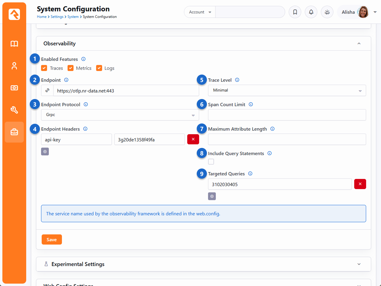 Much of the configuration happens in your observability service of choice. We'd love to help, but keeping tabs on all those external services is like herding cats. But don't sweat it, we've got your back for the Rock side of things. And on the New Relic side of things, you’ll find it’s pretty easy. Just go to newrelic.com and click the “Get Started Free” button. Back in Rock, head over to Admin Tools > Settings > System Configuration. Look for the Observability section, nestled beneath UI Settings. This is where your Rock setup will take place. Ready to dive in and get things rolling? System Configuration Enabled Features - Select which observability features to enable: Traces, Metrics, and/or Logs.Endpoint - Here you’ll enter the Endpoint provided by the service you’re using. If you’re in North America and using New Relic, the endpoint will be https://otlp.nr-data.net:443.Endpoint Protocol - Select the protocol that your provider says to use. If you’re using New Relic, select “Grpc”.Endpoint Headers - Insert a row with Key labeled as "api-key." As for the Value, that's where the actual API Key comes into play, something you'll acquire from the service you're partnering with. If you're following the New Relic route, they refer to it as a "license key." You can find the link to access it here under Step 1.Trace Level - The amount of trace data to send to the observability endpoint. Choose Minimal or Full.Span Count Limit - Some data collectors limit how many spans can be attached to a single trace. When a trace reaches this number, additional spans are truncated before sending. If left blank, Rock uses 9,900.Maximum Attribute Length - Some collectors drop spans with attributes that exceed a maximum length. Rock caps attribute values to this length. If left blank, Rock uses 4,000.Include Query Statements - When enabled, Rock includes all SQL query statements in database activities. When disabled, statements are only included for targeted queries.Targeted Queries - You can list queries to gather more data, including their origin (displayed as a full stack trace). You’ll need to enter the query’s hash, which you’ll find associated with the query in New Relic or other services. Displaying a stack trace will slow down performance slightly, so we recommend having Targeted Queries only temporarily while actively investigating a specific query. Targeted queries will display the parameter values within the statement. Exercise caution when enabling this option for queries containing personally identifiable information in the parameters. And that’s it! Filling out this one panel is all you need to do to get connected and start sending telemetry data. We should mention that there’s also an optional setting called "Observability Service Name" under "Web.Config Settings" in System Configuration. It's set as "rock-rms," but you can adjust it to differentiate between production and sandbox environments if necessary. Finally, there’s one last setting you might need to know about. Head over to Admin Tools > Settings > HTTP Modules. Now, don't stress, you usually won't have to tinker here. Just know it's a thing. Your job? Make sure the Observability item is Active, as pictured below. If it’s not, just click on the Observability row and set it to Active.